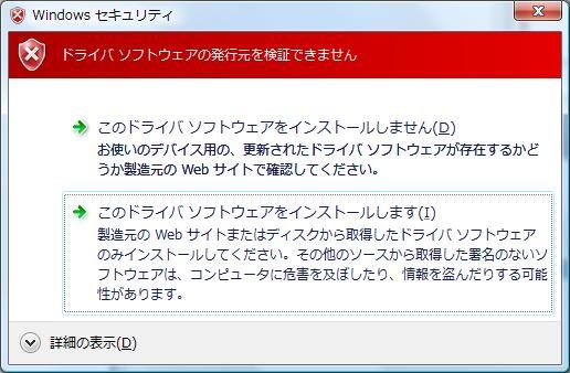 インストールの途中にWindowsセキュリティ画面が表示されるが、当然「このドライバソフトウェアをインストールします(I)」をクリック。
